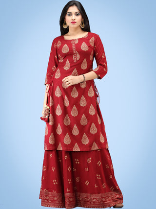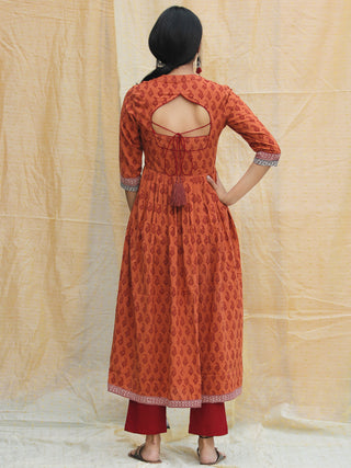 Aalia - Rustic Red Gold Block Print Kurta & Skirt Dress With Tassels - D380FYYY