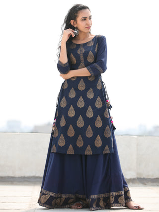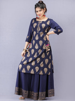 Aalia - Indigo Gold Block Print Kurta & Skirt Dress With Tassels - D380F2001