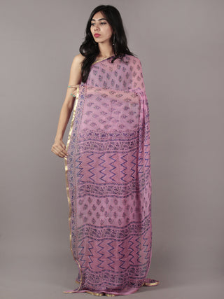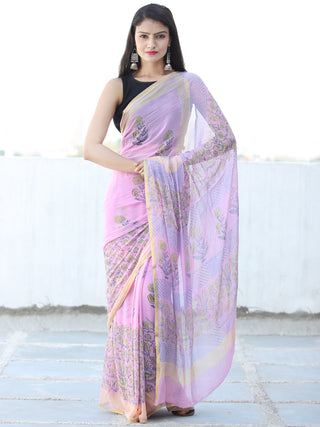 Baby Pink Yellow Hand Block Printed Chiffon Saree with Zari Border - S031703944