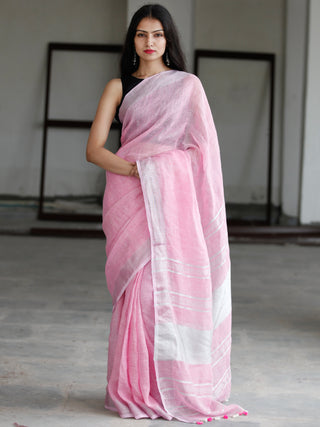 Baby Pink Silver Handwoven Linen Saree With Zari Border & Tassels - S031703751