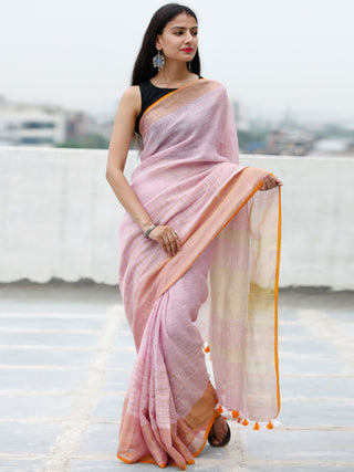 Baby Pink Golden Handwoven Linen Saree With Zari Border & Tassels - S031703767