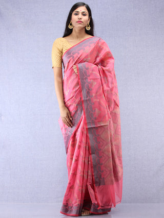Banarasee Chanderi Silk Paisley Saree With Zari Border - Pink & Gold - S031704334