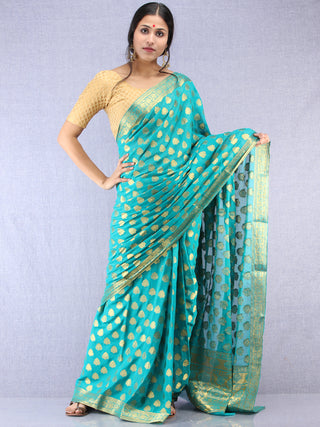 Banarasee Chiffon Saree With Golden Zari Weave - Sea Blue & Gold - S031704364