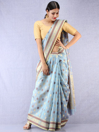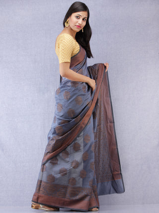 Banarasee Chanderi Silk Paisley Saree With Zari Border - Blue Grey & Gold - S031704332