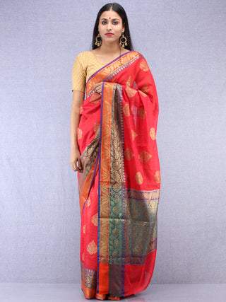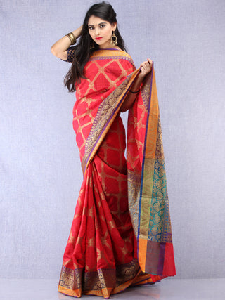 Banarasee Cotton Silk Saree With Zari Work - Coral Red Gold & Purple - S031704406