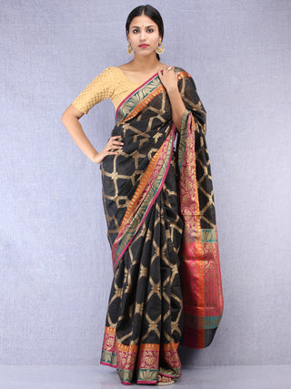 Banarasee Chanderi Silk Saree With Resham Border - Black Pink Copper - S031704322