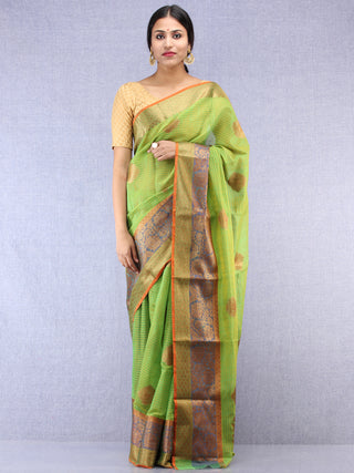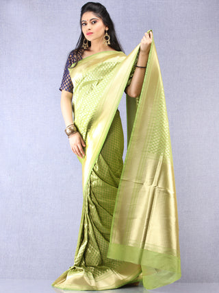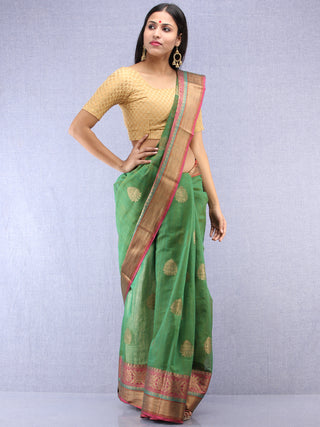 Banarasee Chanderi Silk Paisley Saree With Zari Border - Light Green & Gold - S031704337