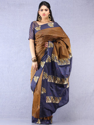 Banarasee Katan Silk Saree With Zari Work - Brown Blue Gold Green - S031704321