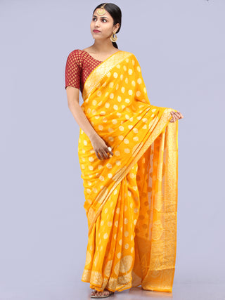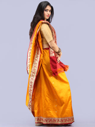 Banarasee Katan Silk Handloom Saree With Zari Work - Golden Yellow Maroon & Gold - S031704303