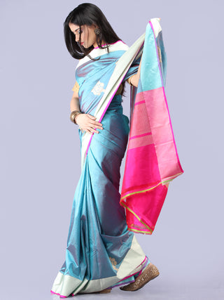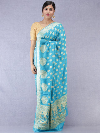 Banarasee Pure Katan Silk Handloom Saree With Zari Work - Turquoise Blue & Silver - S031704305
