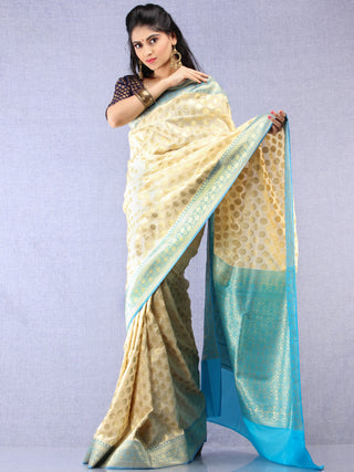 Banarasee Organza Saree With Zari & Resham Work - Ivory Sky Blue & Gold - S031704312