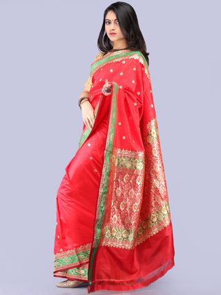 Banarasee Katan Silk Handloom Saree With Zari Work - Red Green & Gold - S031704295