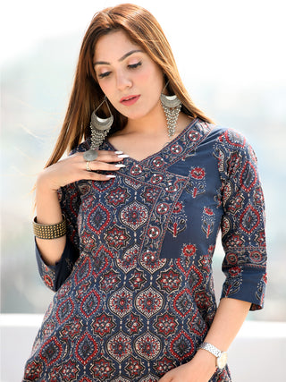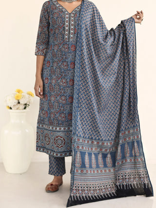 Ajrakh Damini Set Of Kurta With Pockets Pants Dupatta