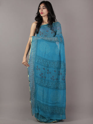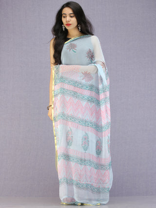 Baby Blue Pink Green Hand Block Printed Chiffon Saree with Zari Border - S031704594
