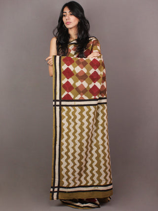 Asparagus Green White Maroon Pink Bagru Dabu Hand Block Printed in Cotton Mul Saree - S03170860
