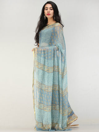 Baby Blue Mustard Hand Block Printed Chiffon Saree with Zari Border - S031704554