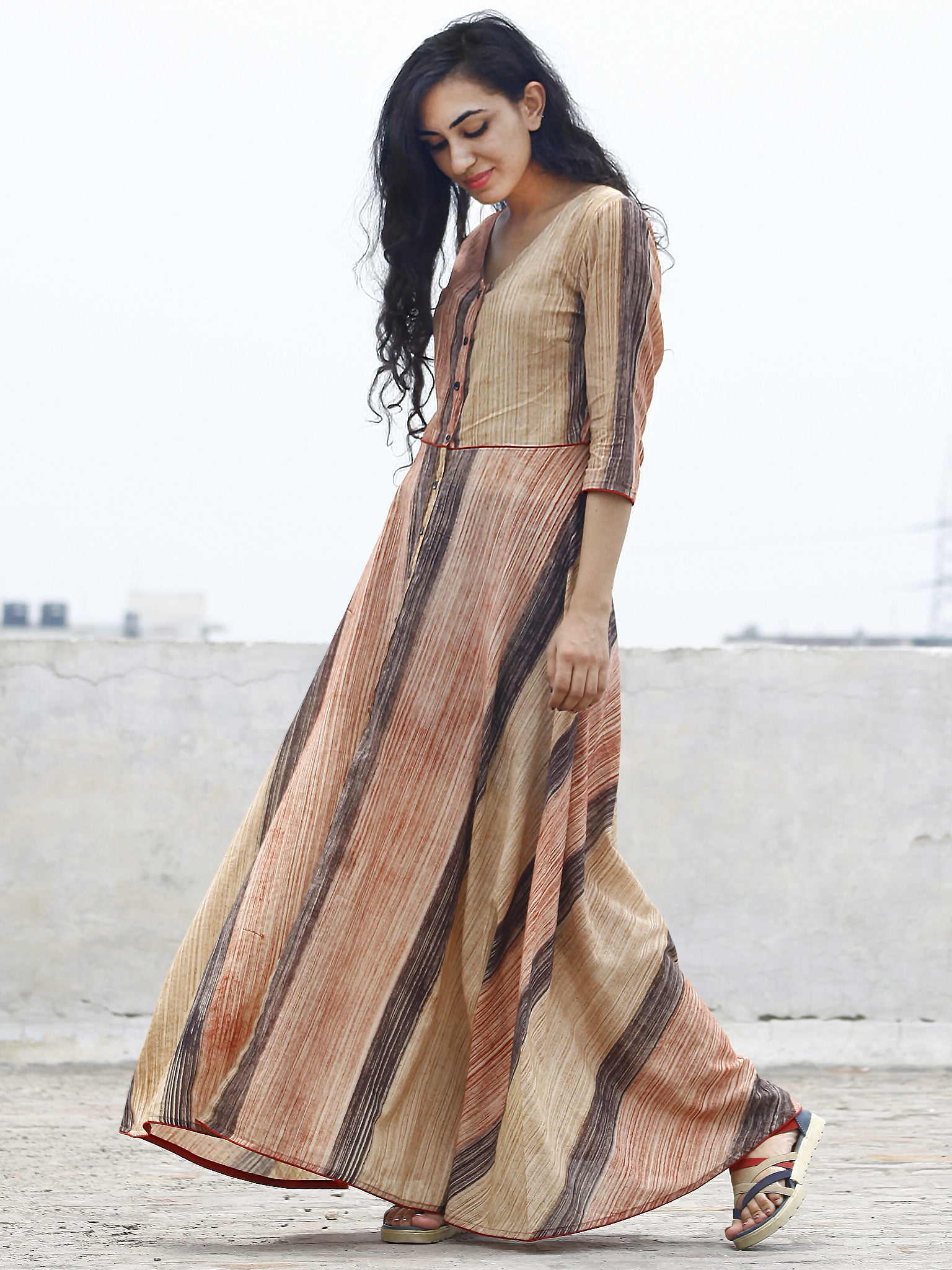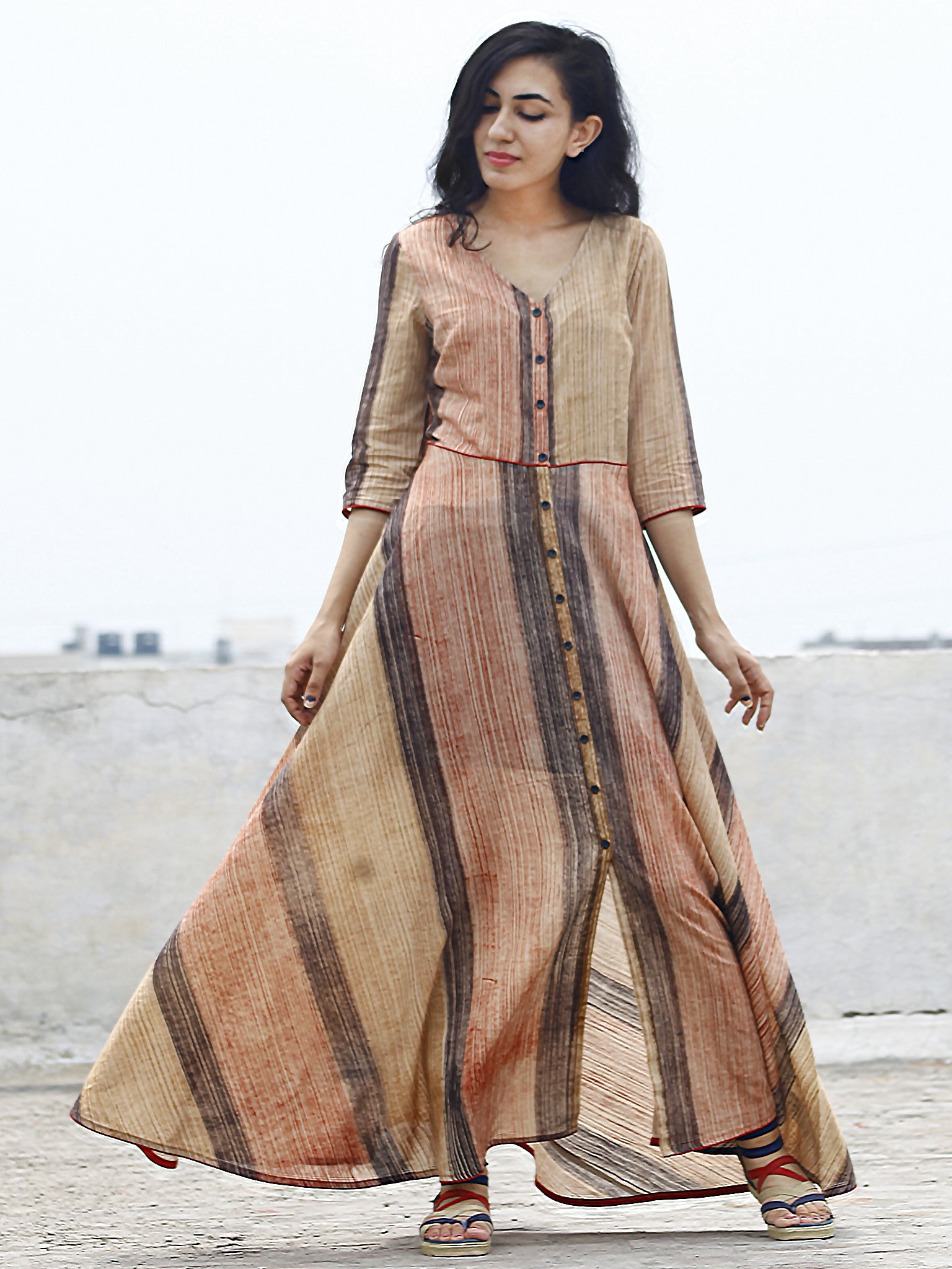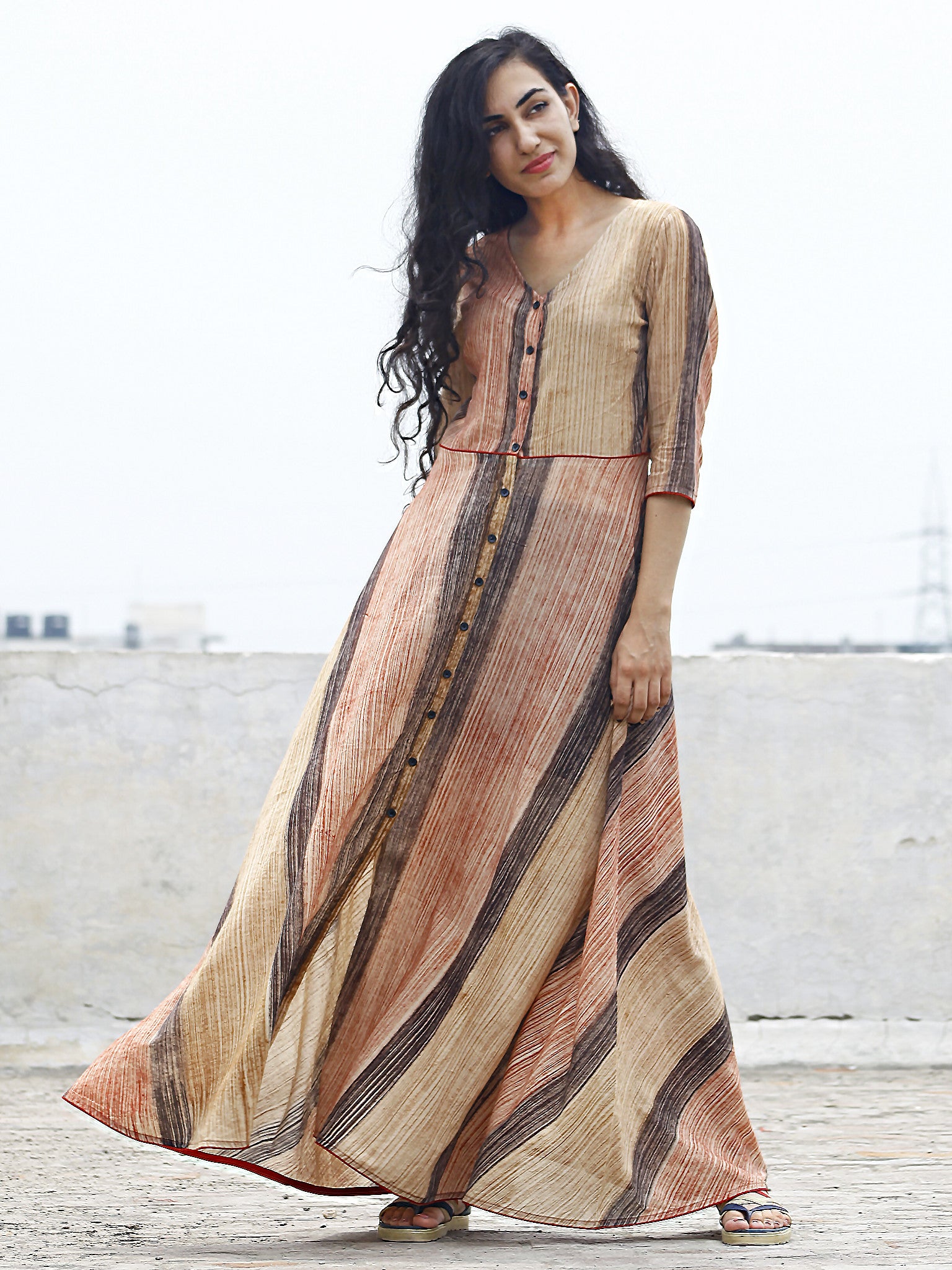 Beige Red Black Hand Brush Painted Long Cotton Dress With Front Opening - D79F781