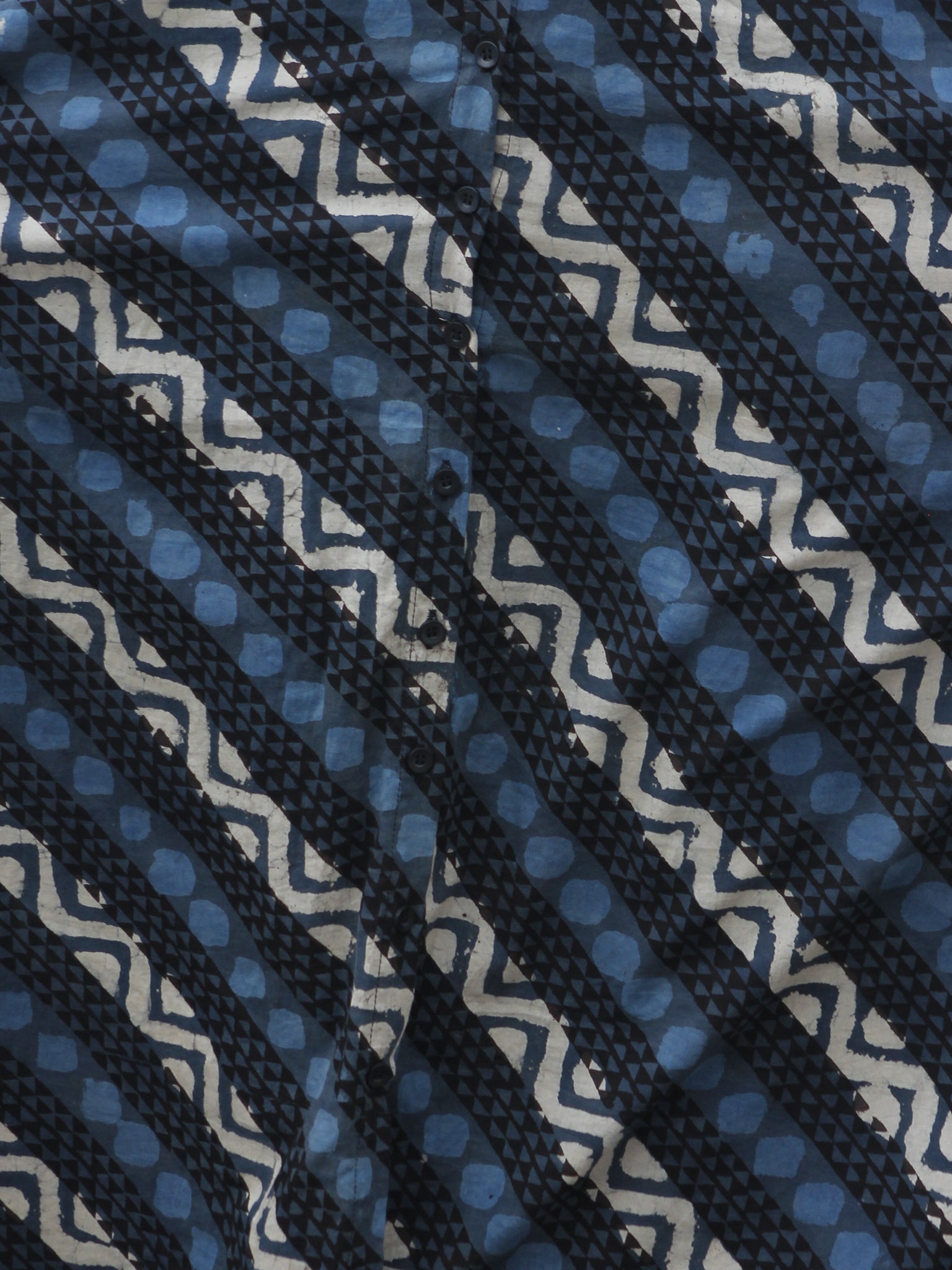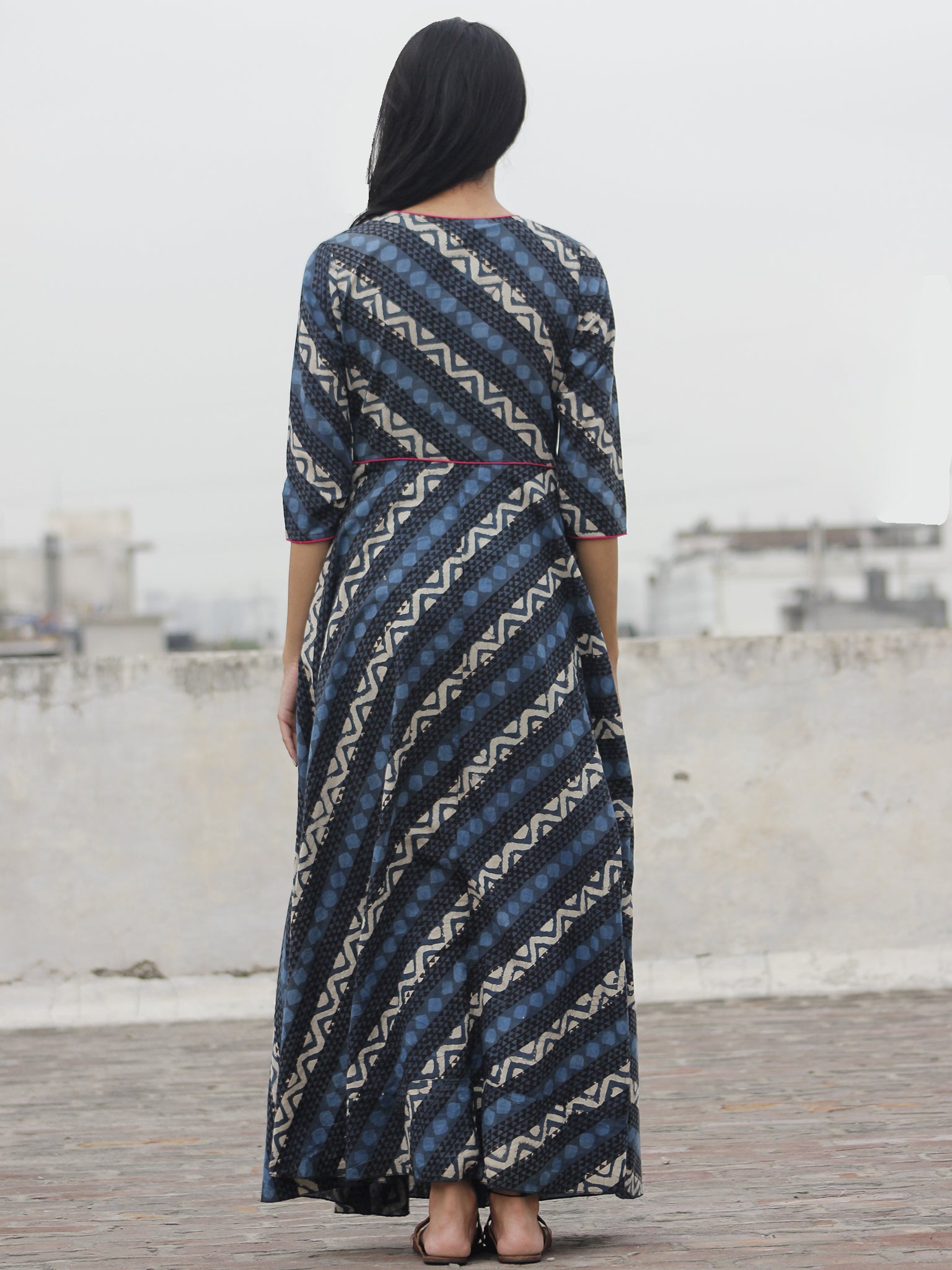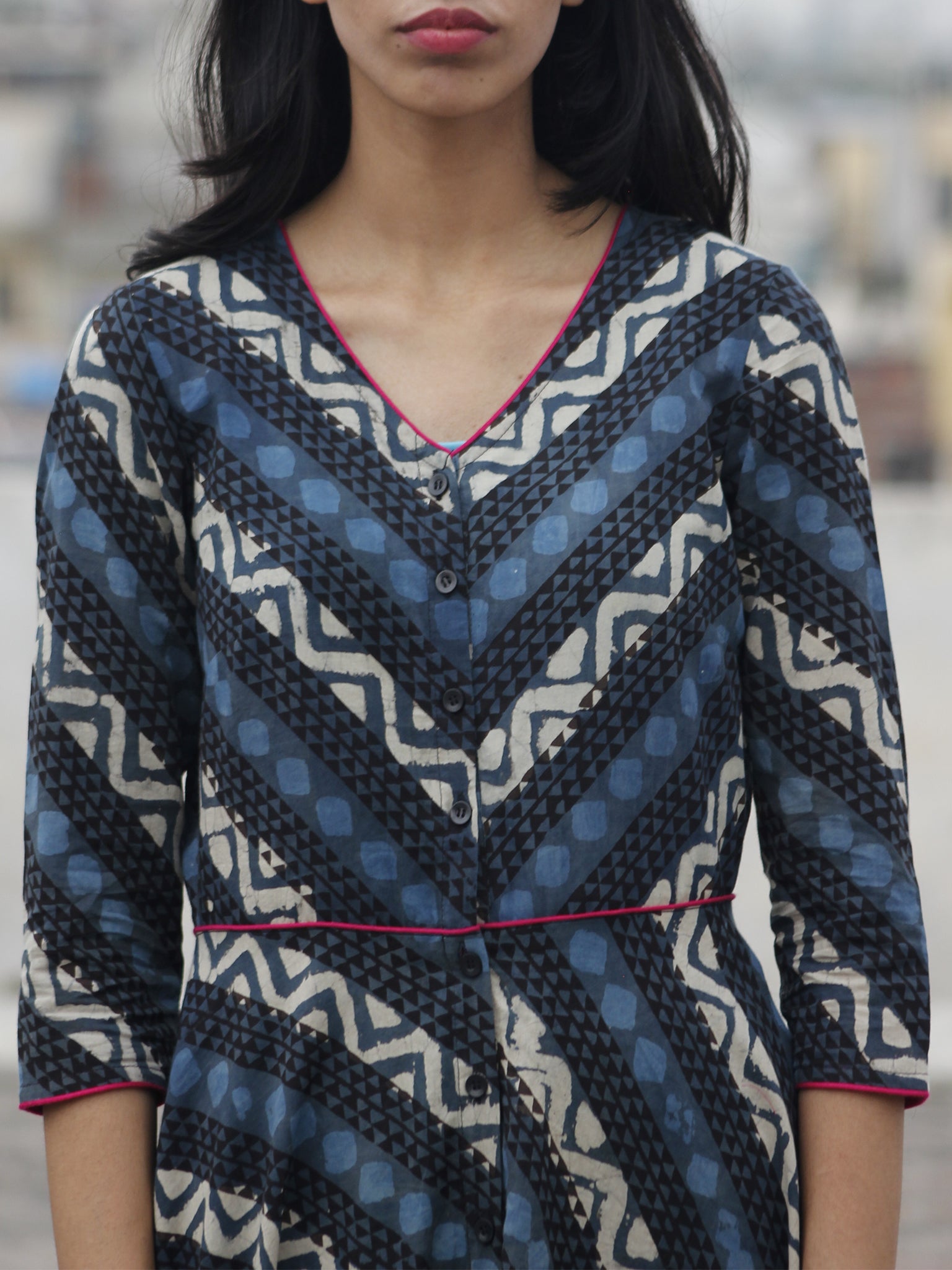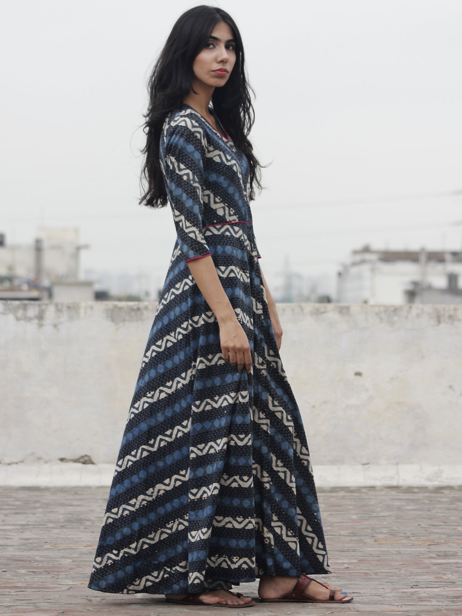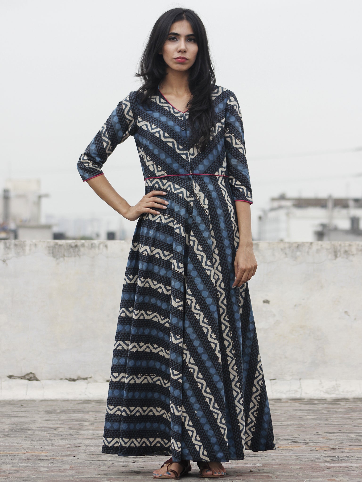 Grey Indigo Ivory Black Hand Block Printed Long Cotton Dress With Front Opening - D79F901