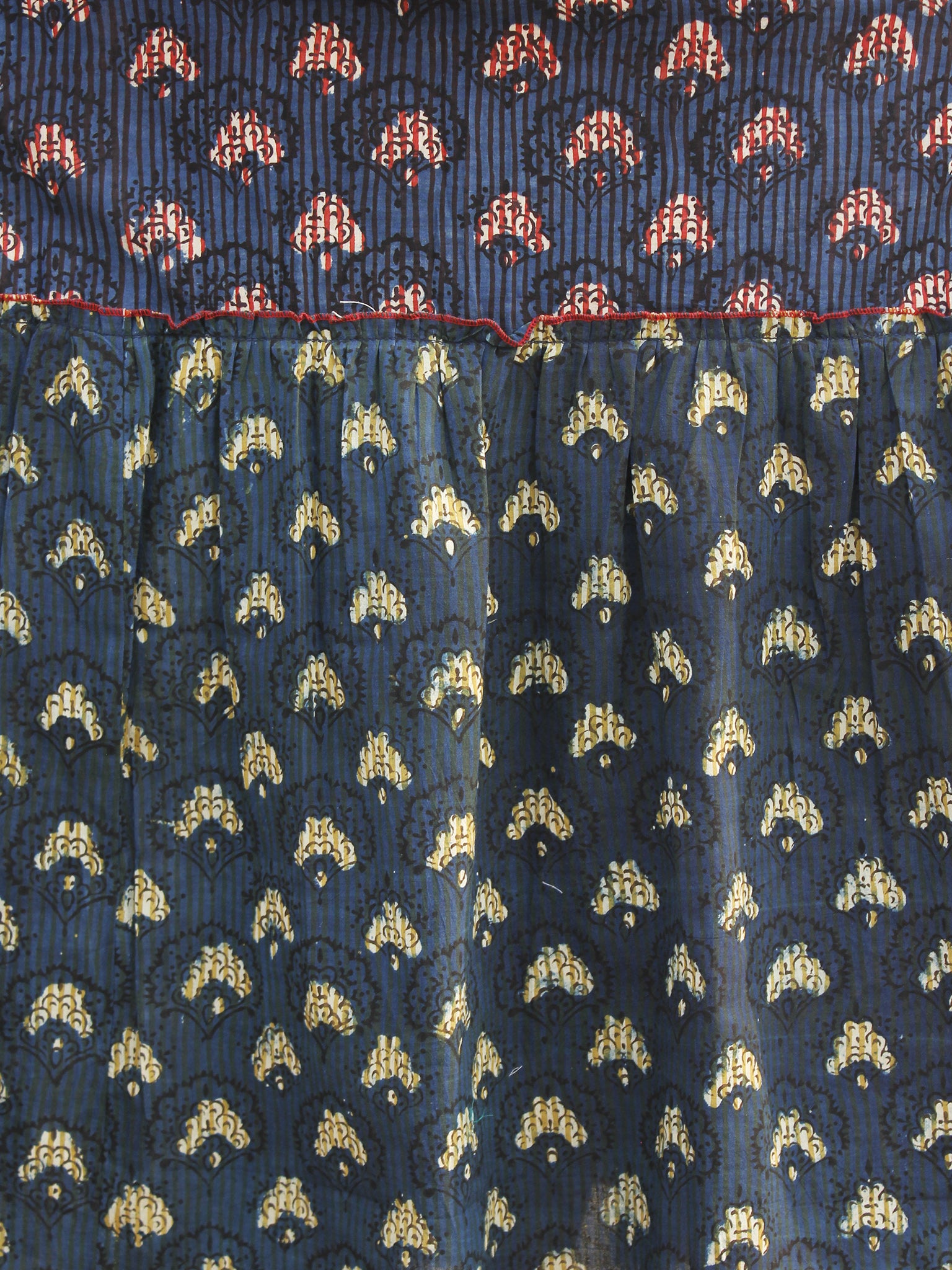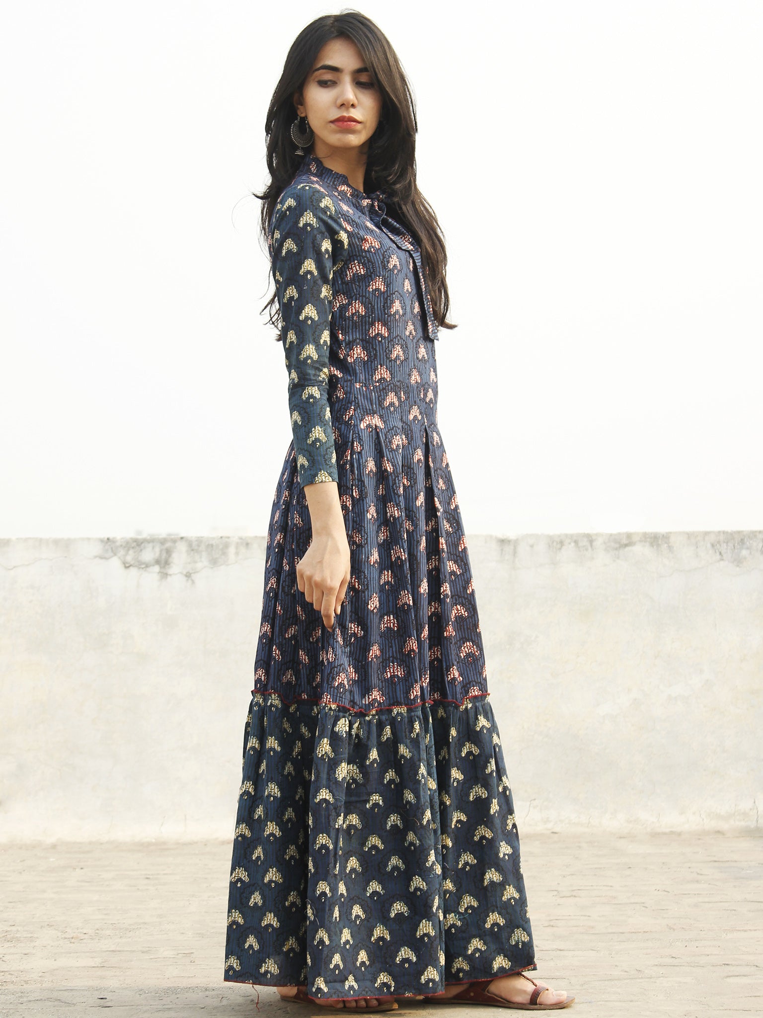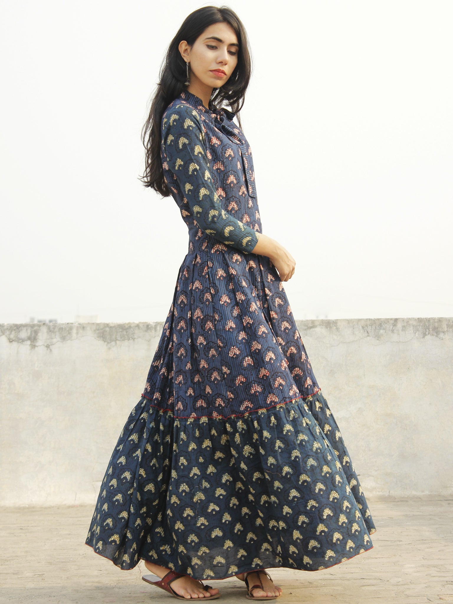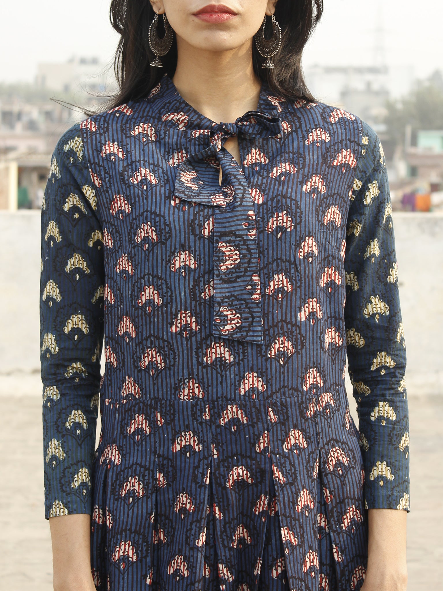 Indigo Ivory Red Black Long Hand Block Cotton Tier Dress With Pussy Cat Bow - D141F999