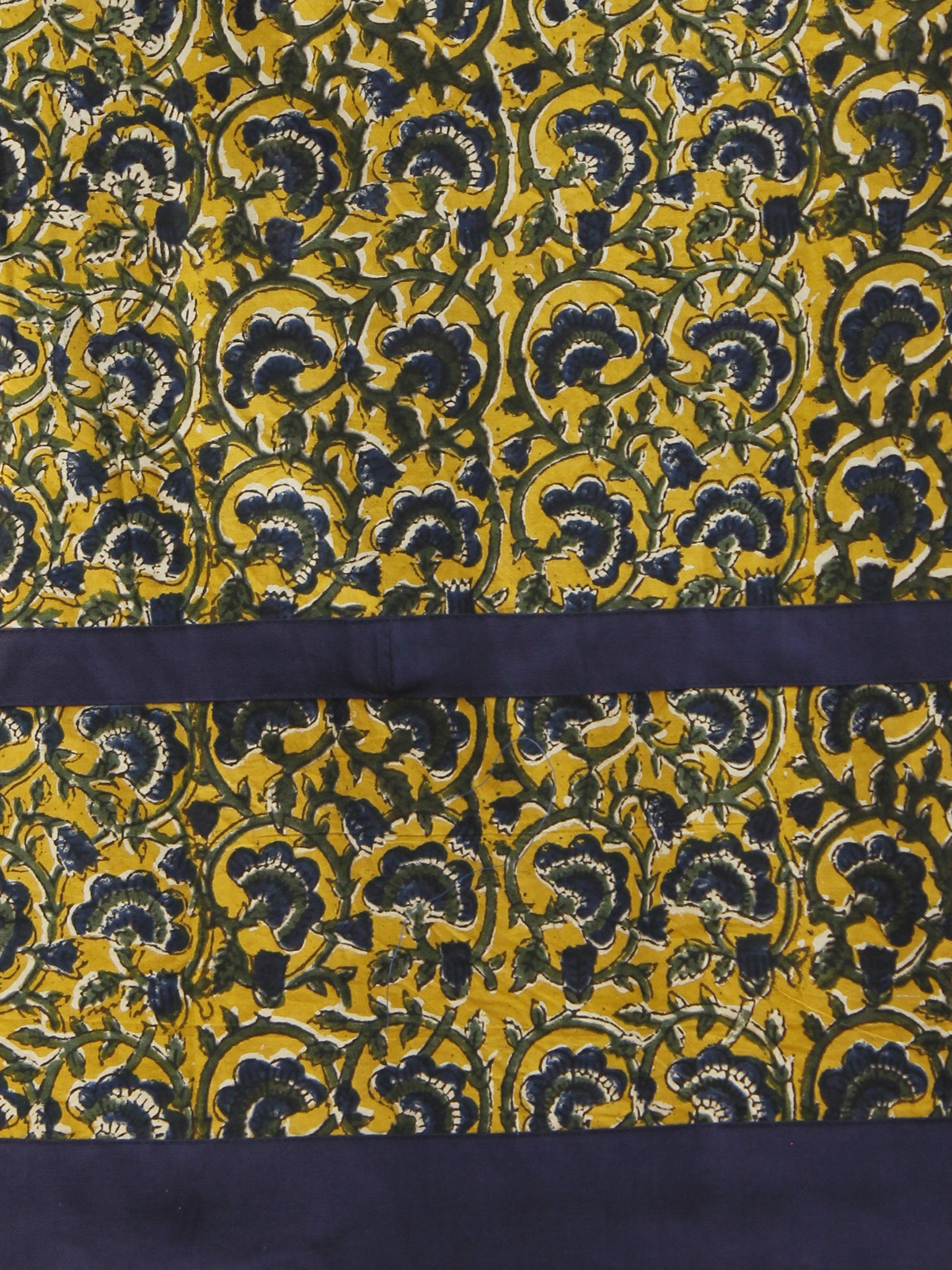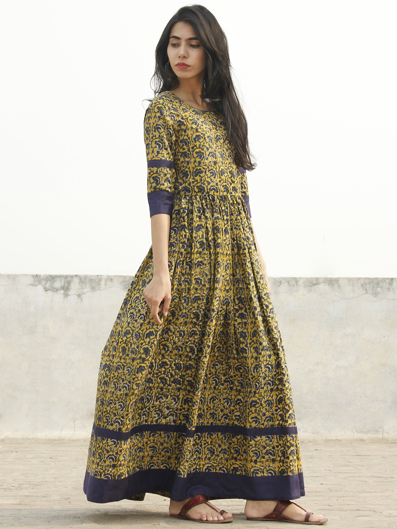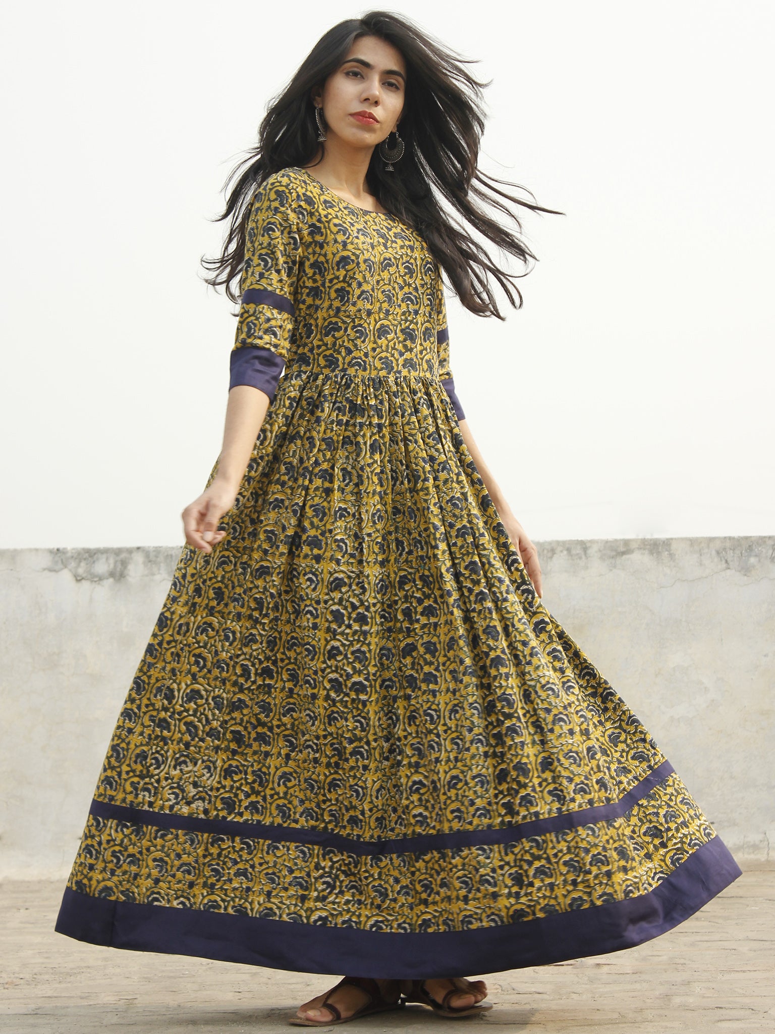 Mustard Yellow Indigo Green Ivory Long Hand Block Cotton Dress With Back Details - D137F994