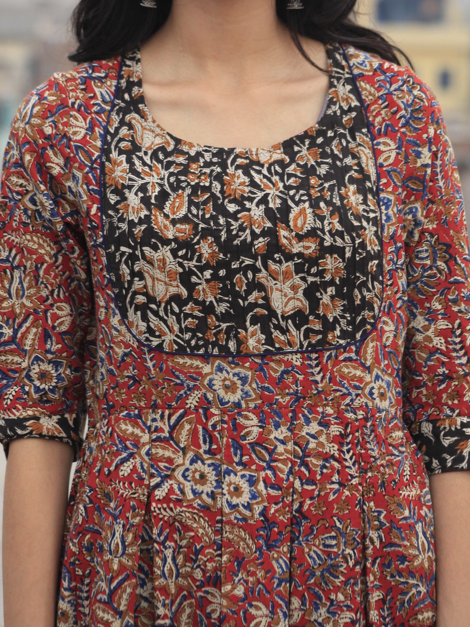 Red Beige Blue Mustard Black Hand Block Printed Cotton Dress With Box Pleats and side pockets- D70F577
