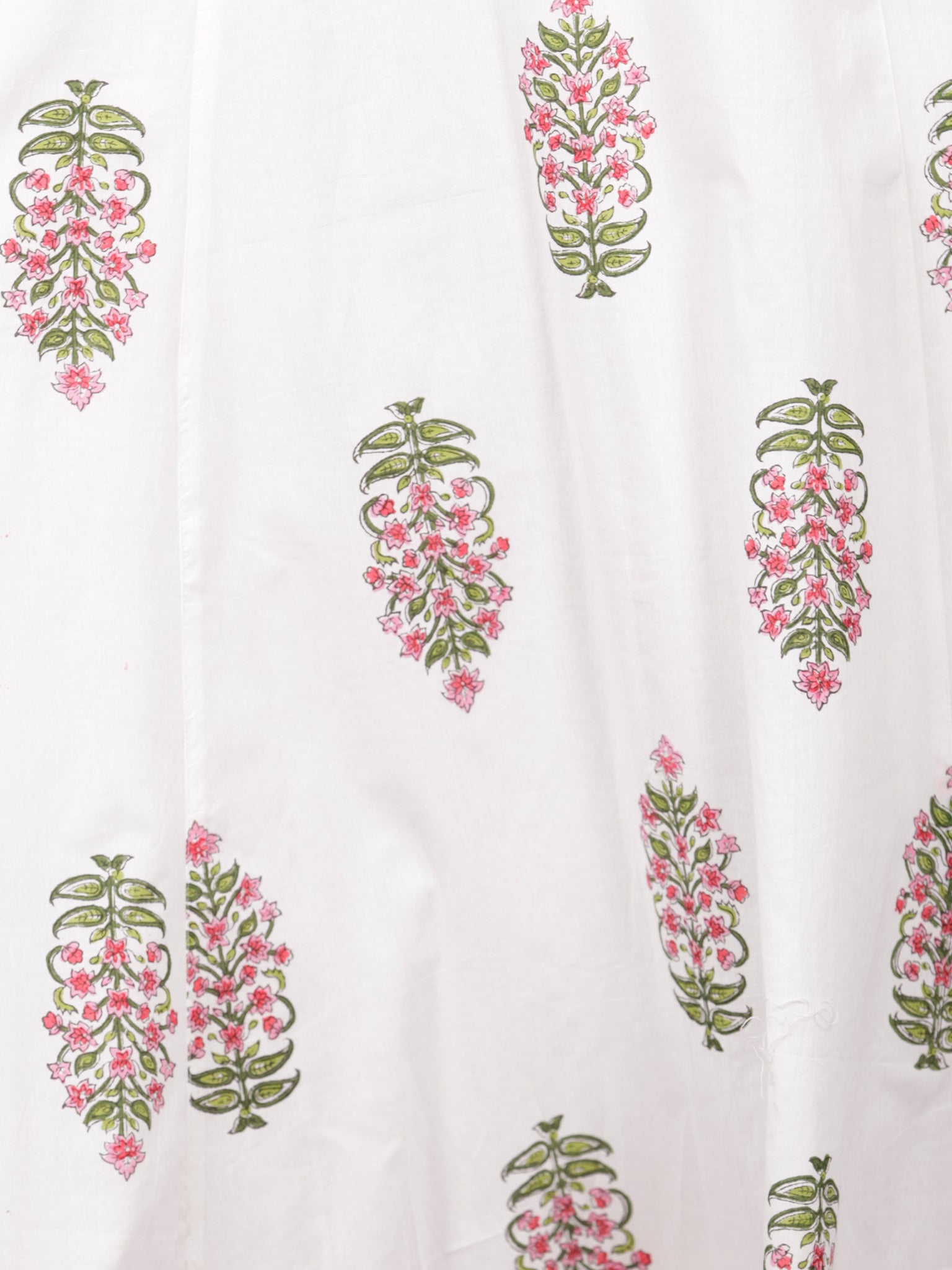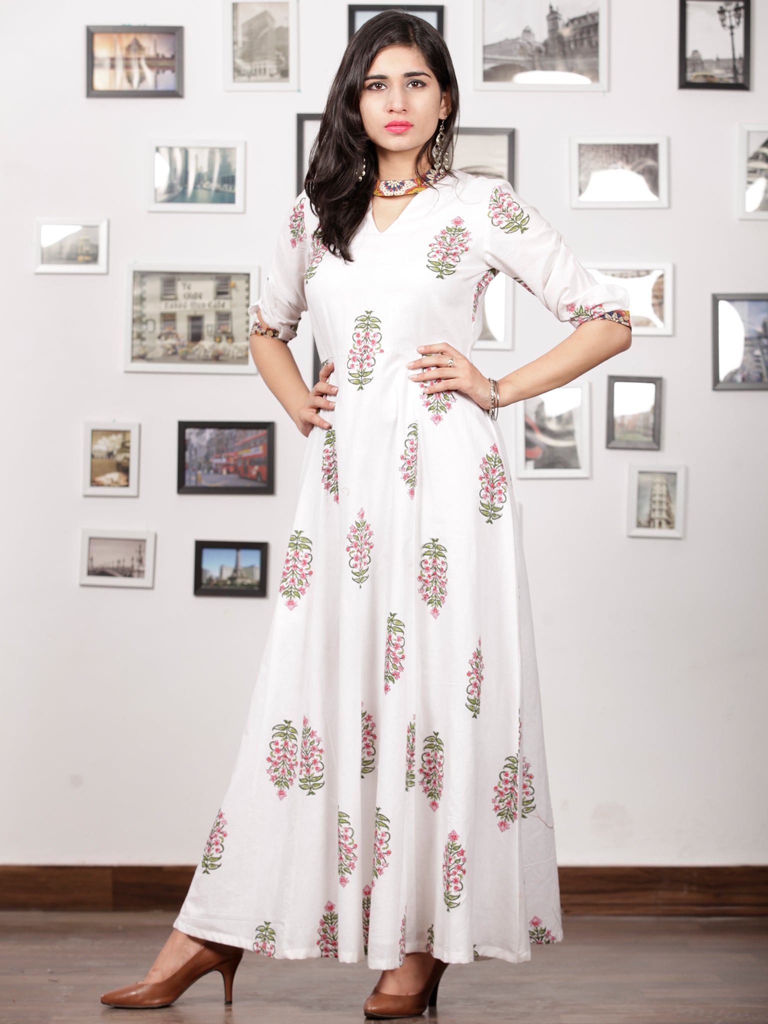 White Pink Green Hand Block Printed Panel Cotton Long Dress - D282BF1502