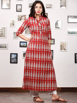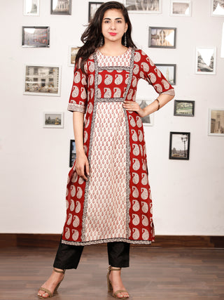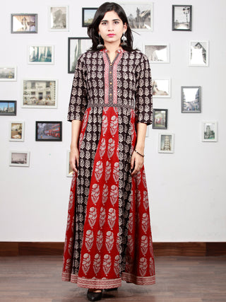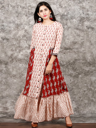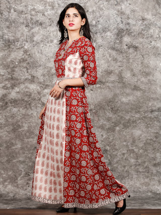 White Red Black Bagh Printed Panelled Cotton Long Dress With Front Open - D293F1719