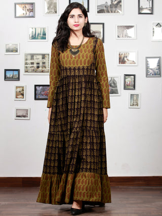 Yellow Black Maroon Bagh Printed Cotton Long Tier Dress - D135F1701