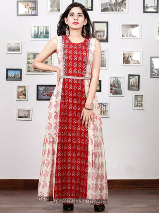 White Red Black Bagh Printed Cotton Long Sleeveless Dress With Tier - D297F1721