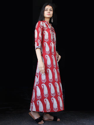 Red White Black Bagh Printed Panel Cotton Long Dress With Stand Collar - D294F1710