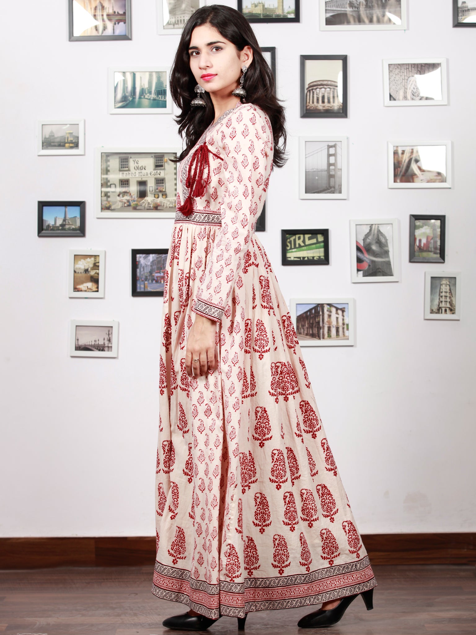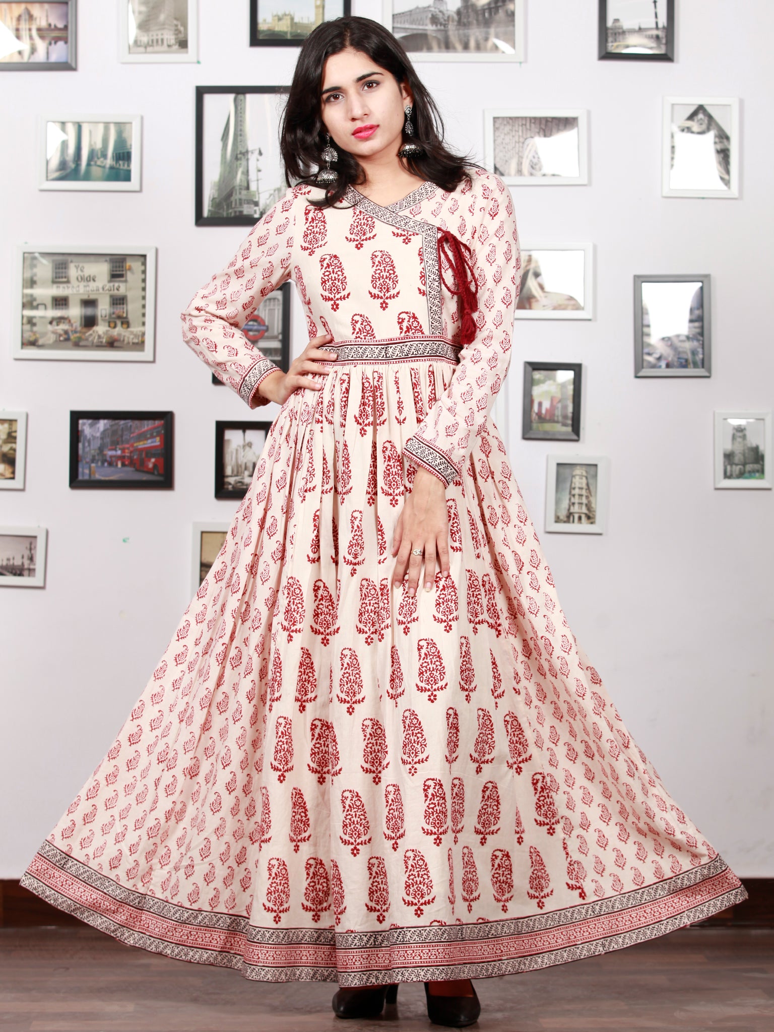White Red Black Bagh Printed Cotton Long Angrakha Dress With Gathers - D298F1719