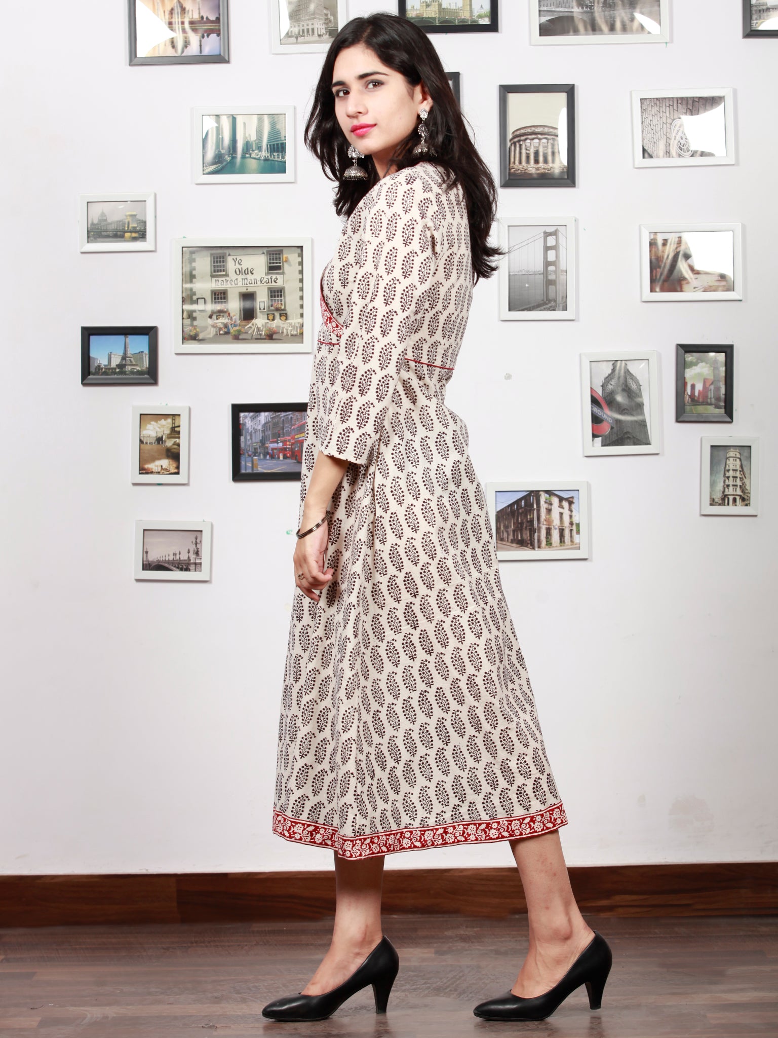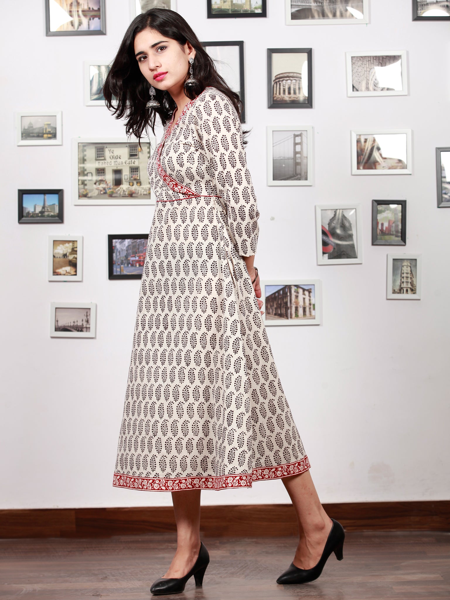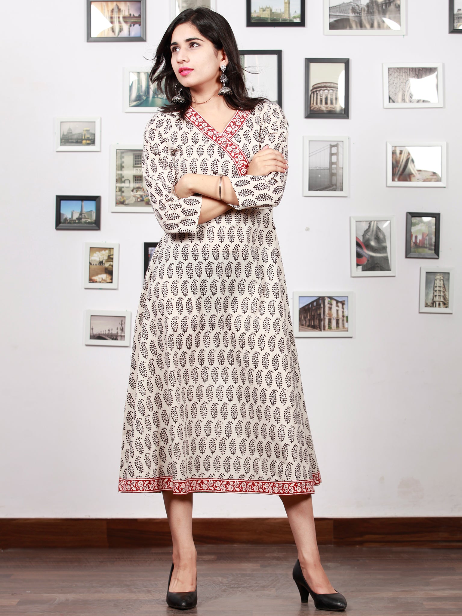 White Red Black Bagh Printed Cotton Midi Length Angrakha Dress - D299F1702