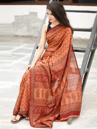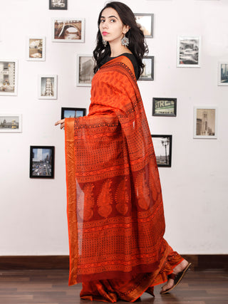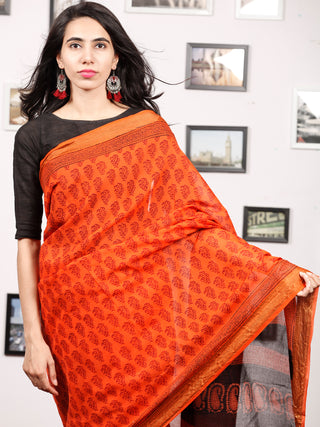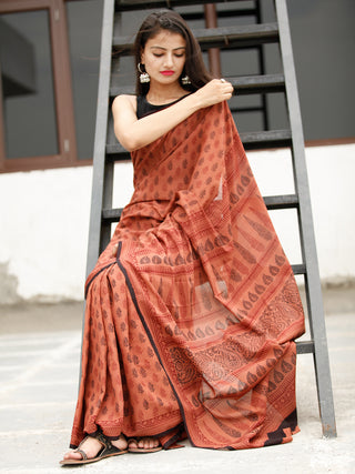 Rust Orange Maroon Black Bagh Hand Block Printed Maheswari Silk Saree With Resham Border - S031703828