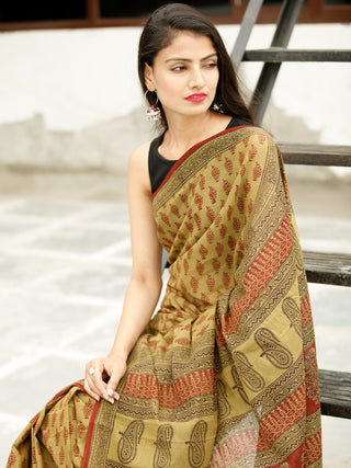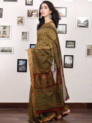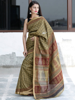 Olive Green Maroon Black Bagh Hand Block Printed Cotton Saree - S031703819