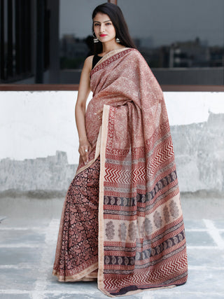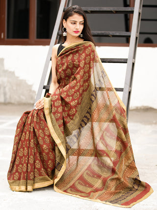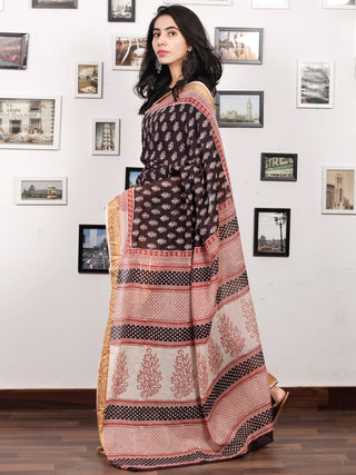 Brown Maroon Black Bagh Hand Block Printed Maheswari Silk Saree - S031703824