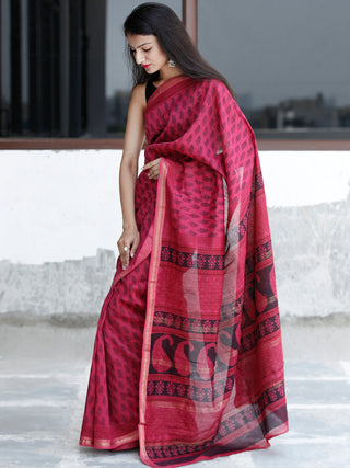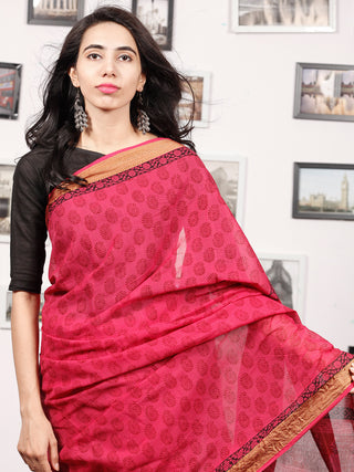 Pink Black Bagh Hand Block Printed Maheswari Silk Saree With Resham Border - S031703826