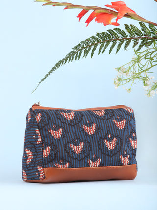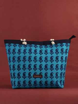 Navy Blue Hand Block Printed Vegan Leather Bucket Style Hand Bag - B1509