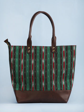 Green Brown Red Ikat & Vegan Leather Tote Bag - B1004