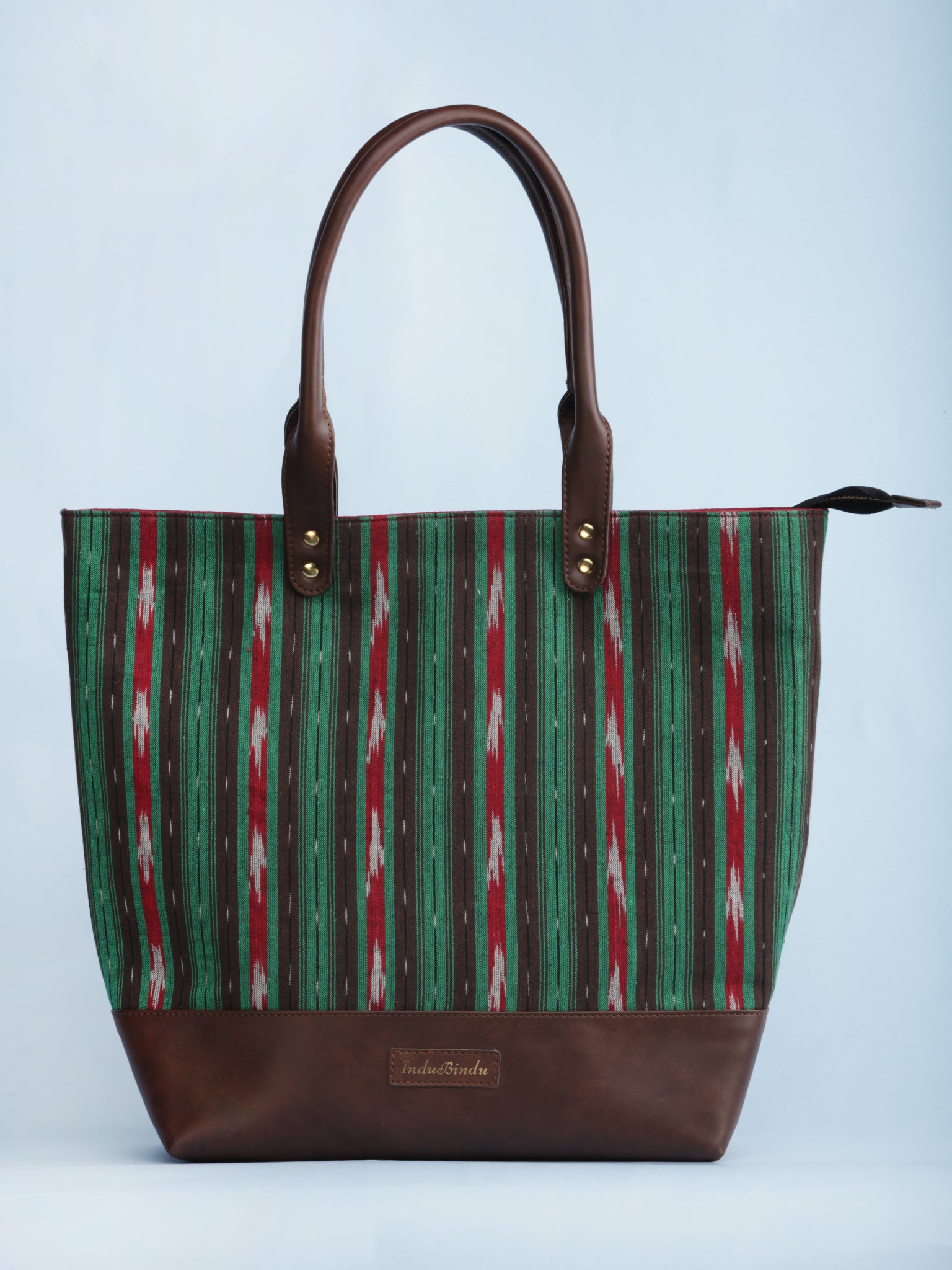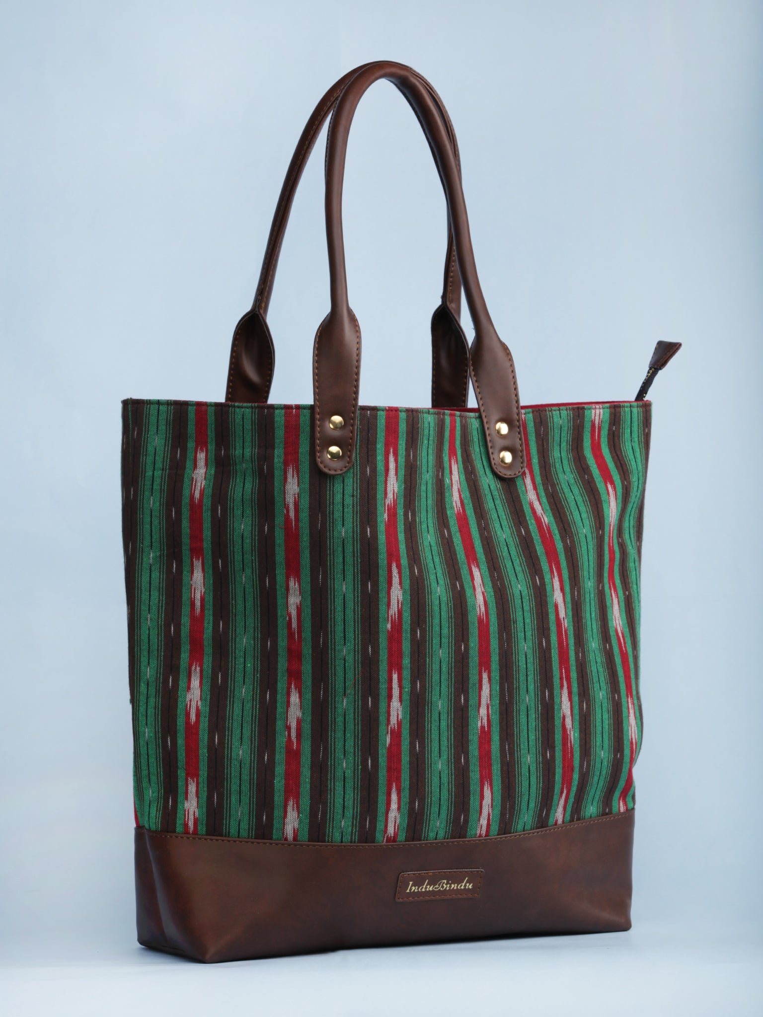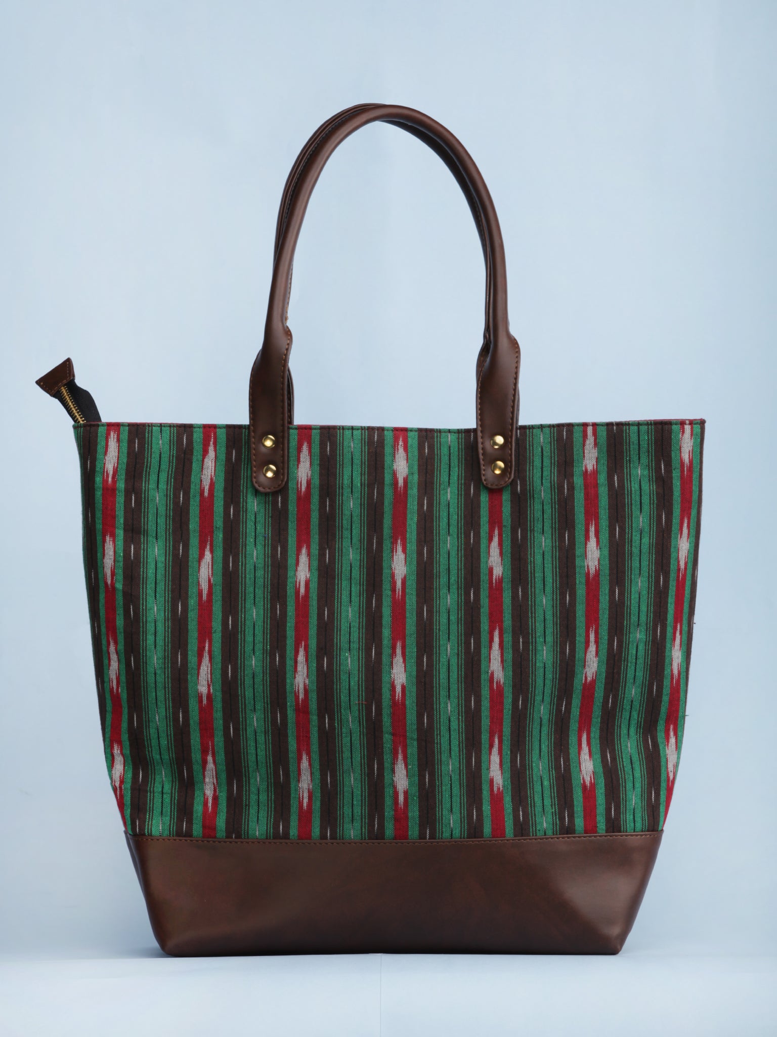 Green Brown Red Ikat & Vegan Leather Tote Bag - B1004