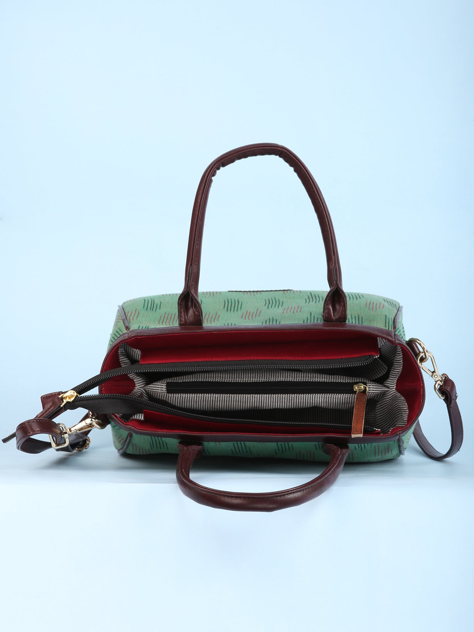 Green Ikat & Vegan Leather Bucket Style Hand Bag - B1504