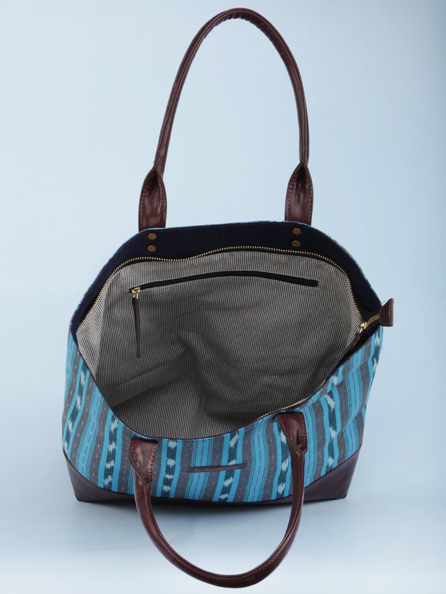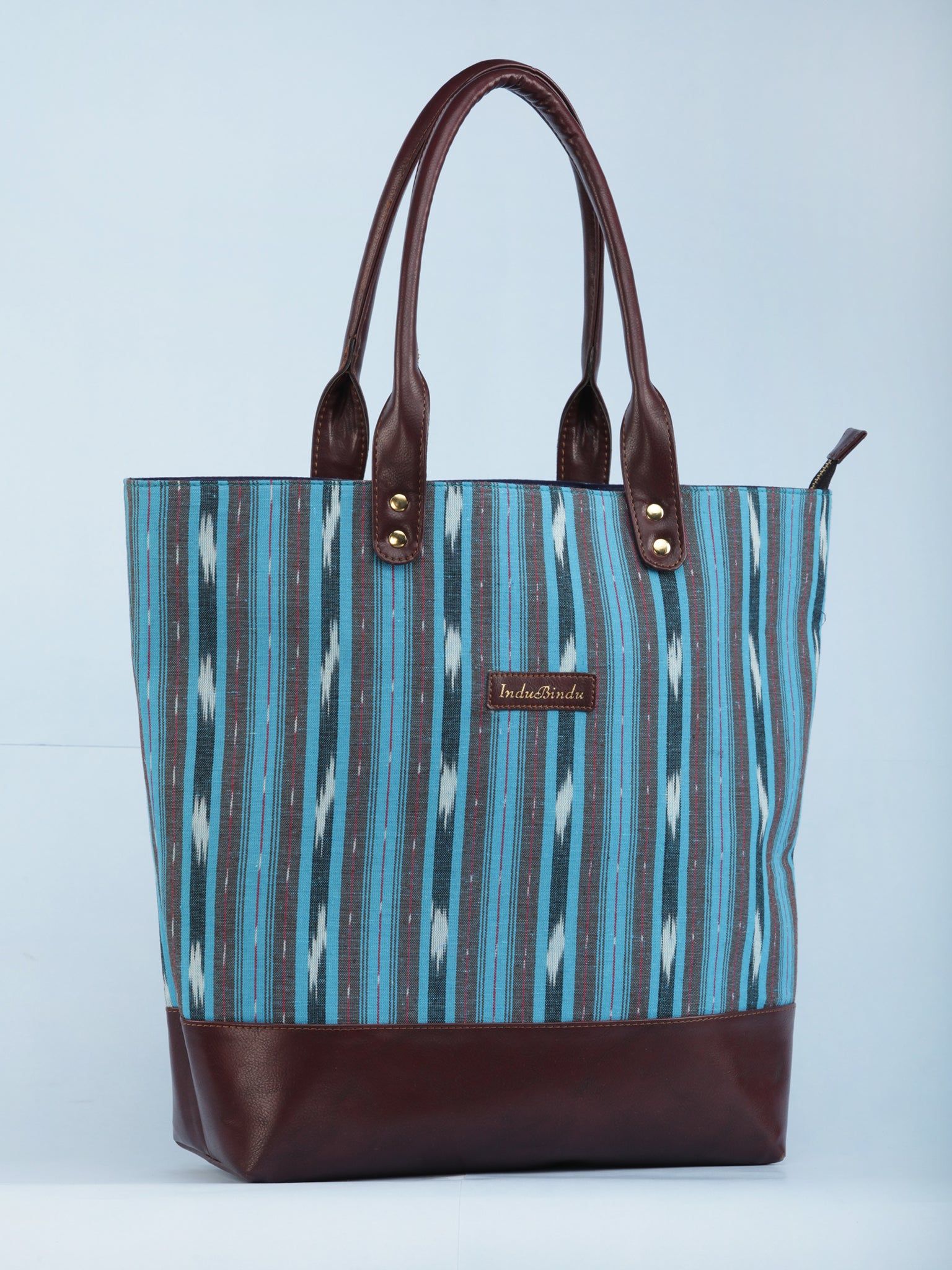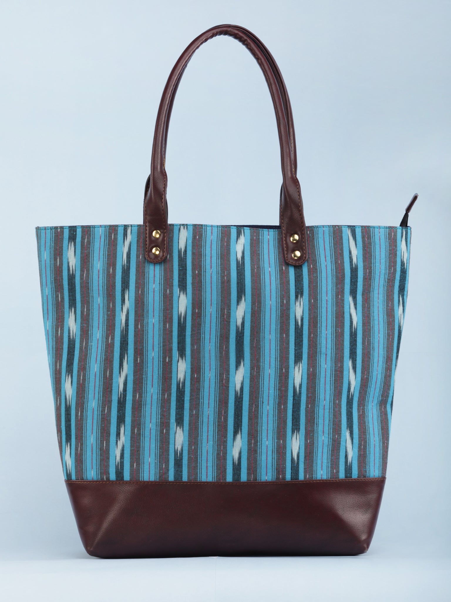 SkyBlue Indigo Brown Ikat & Vegan Leather Tote Bag - B1007