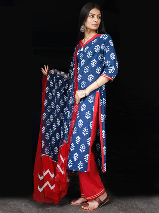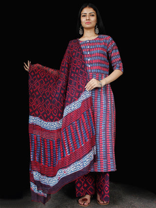 Indigo Red Purple Ivory Kantha Stitched Cotton Block Printed Suit - Set of 3 - SS01F018