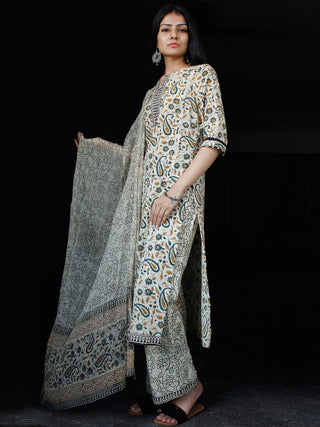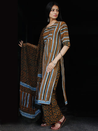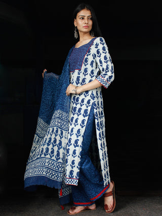 Indigo Rust Ivory Kantha Stitched Cotton Block Printed Suit - Set of 3 - SS01F019