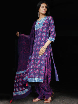 Purple Lavender Indigo Cotton Block Printed Suit With Kantha Work - Set of 3 - SS01F017