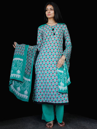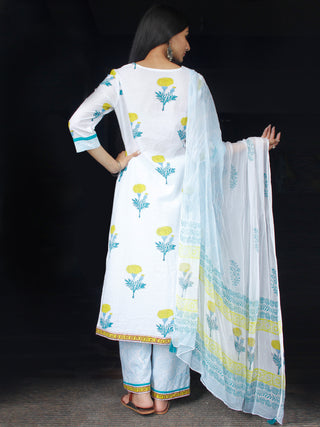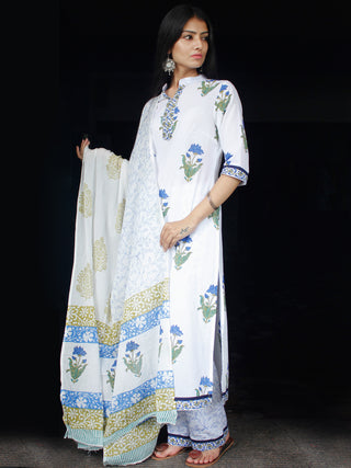 Sky Blue Coral Cotton Block Printed Suit With Kantha Work - Set of 3 - SS01F014