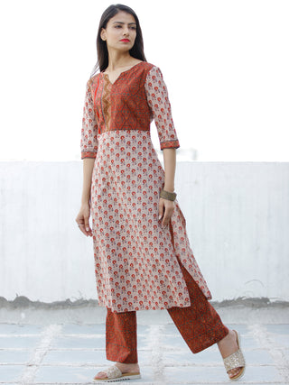 Beige Brown Green Cotton Block Printed Kurta & Pants - Set of 2 - SS01F1876