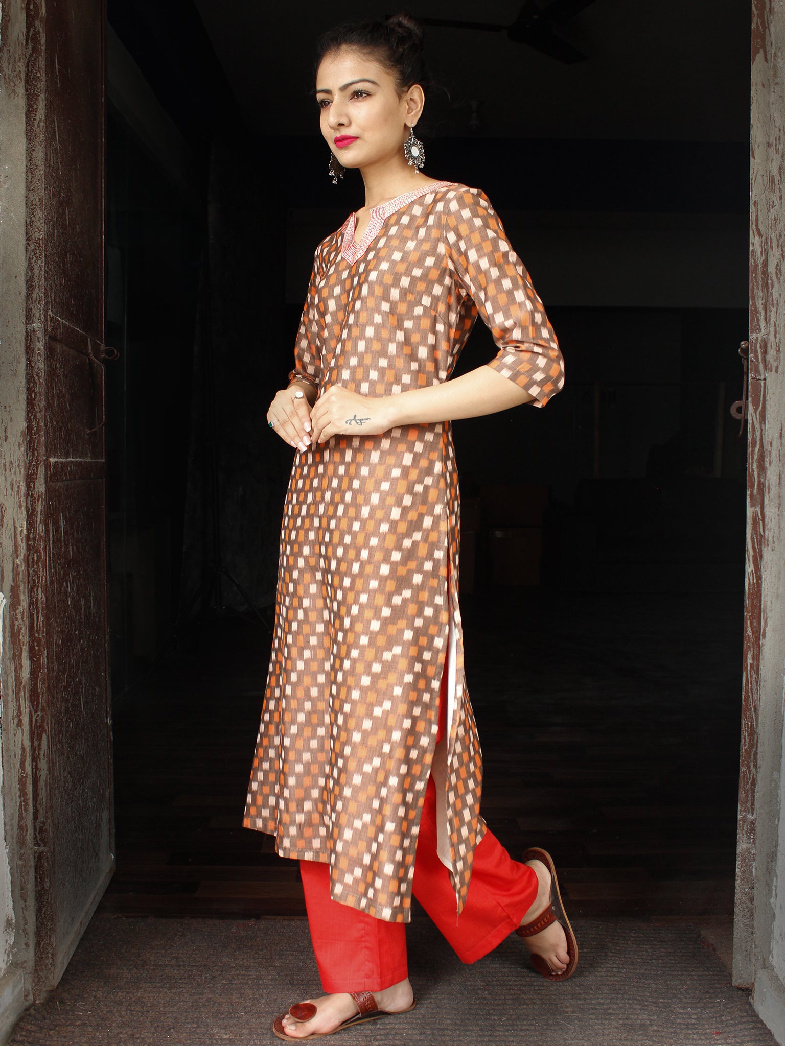 PRODUCT: This Set Contains Kurta with Neck Embroidery details and Pant . The fabric of this dress is 100% pure cotton, fully hand-woven in Ikat style of dyeing.