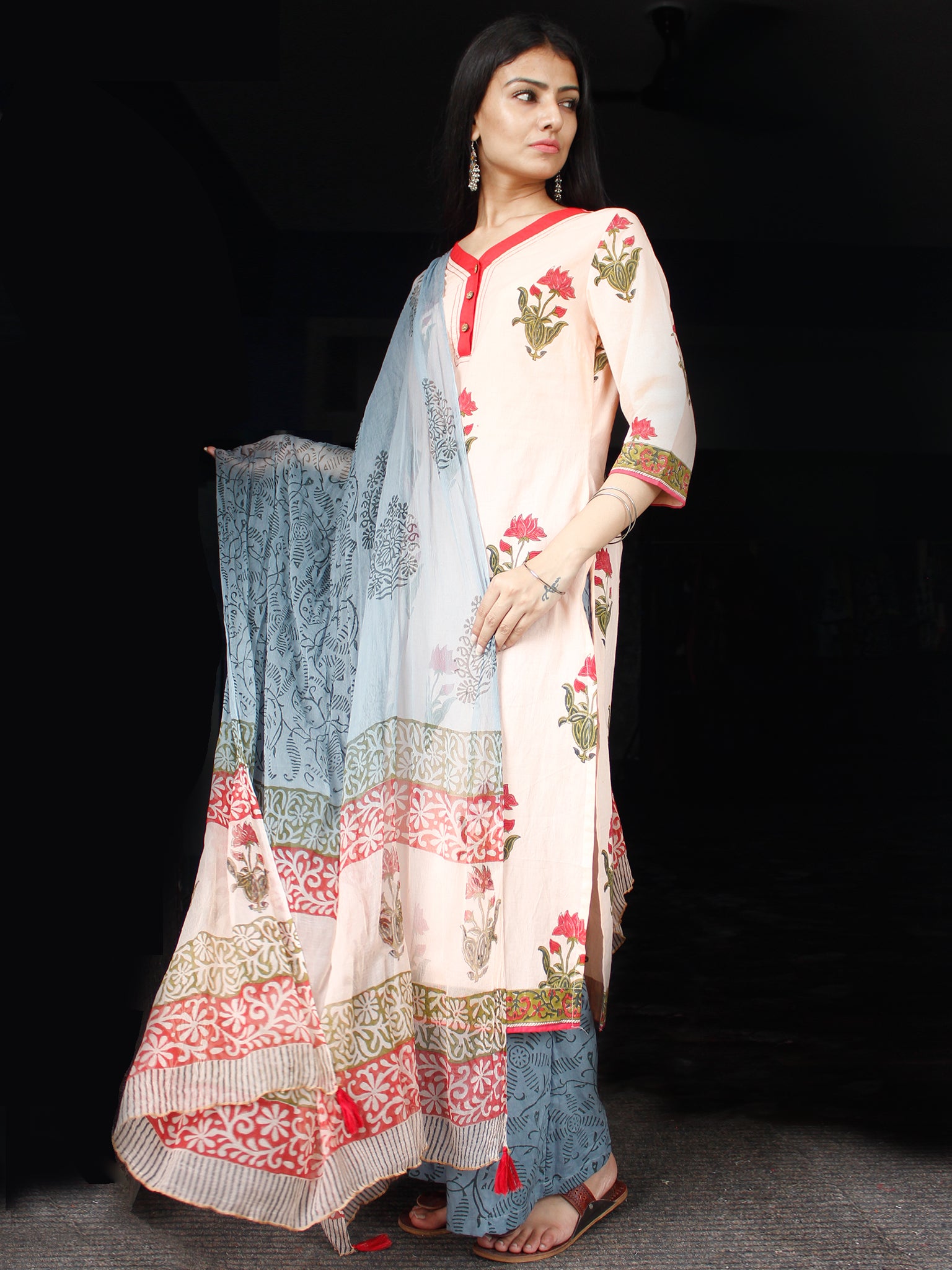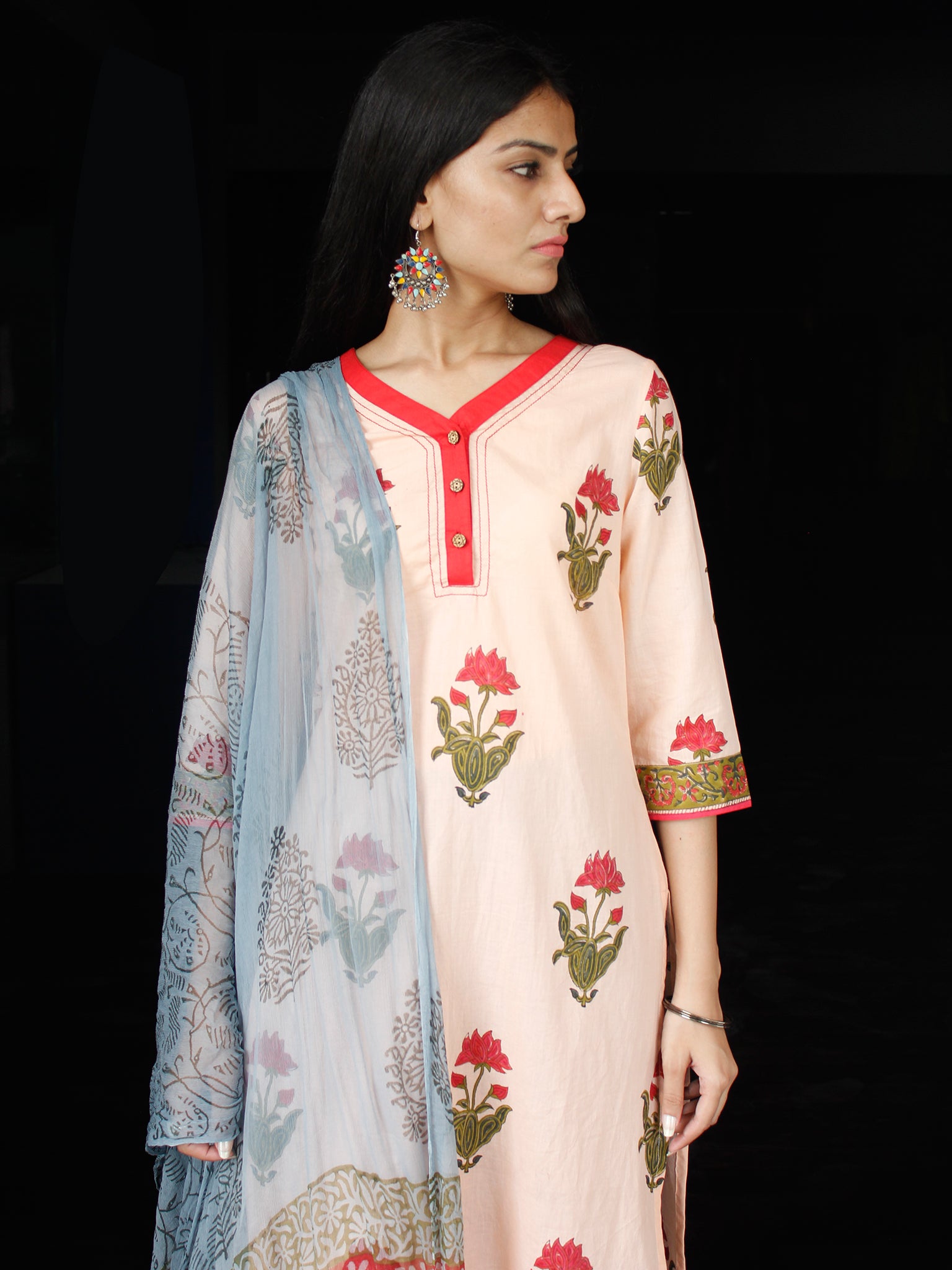 Peach Olive Green Coral Cotton Block Printed Suit - Set of 3 - SS01F012