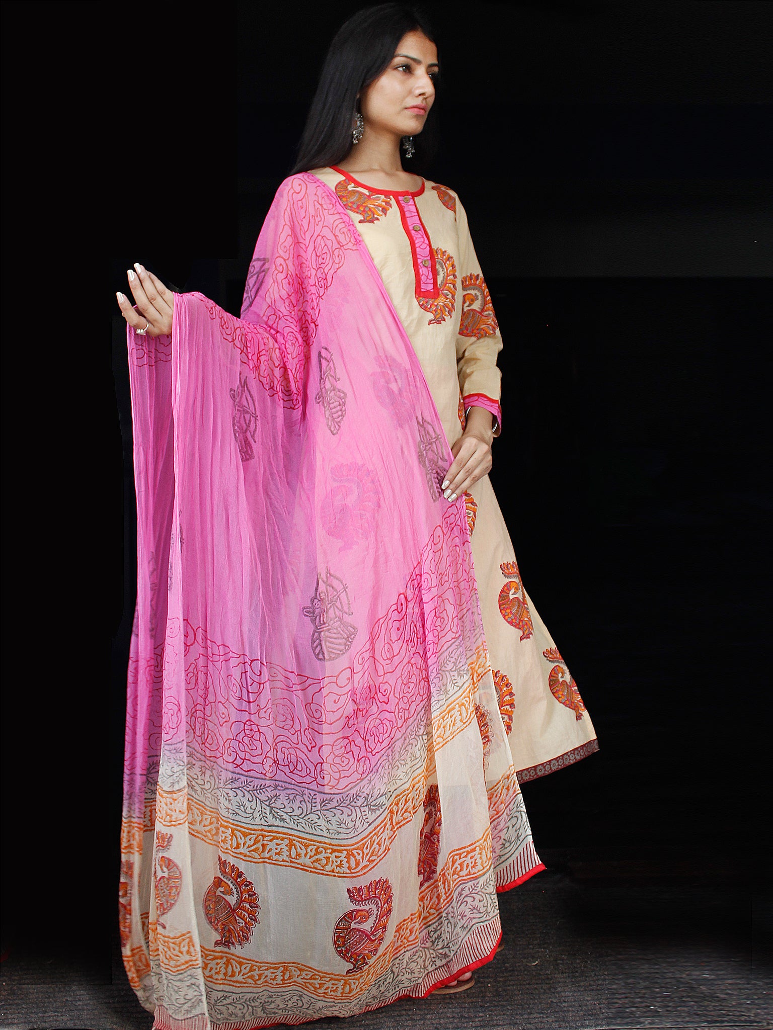 Peach Orange Pink Cotton Block Printed Suit - Set of 3 - SS01F021