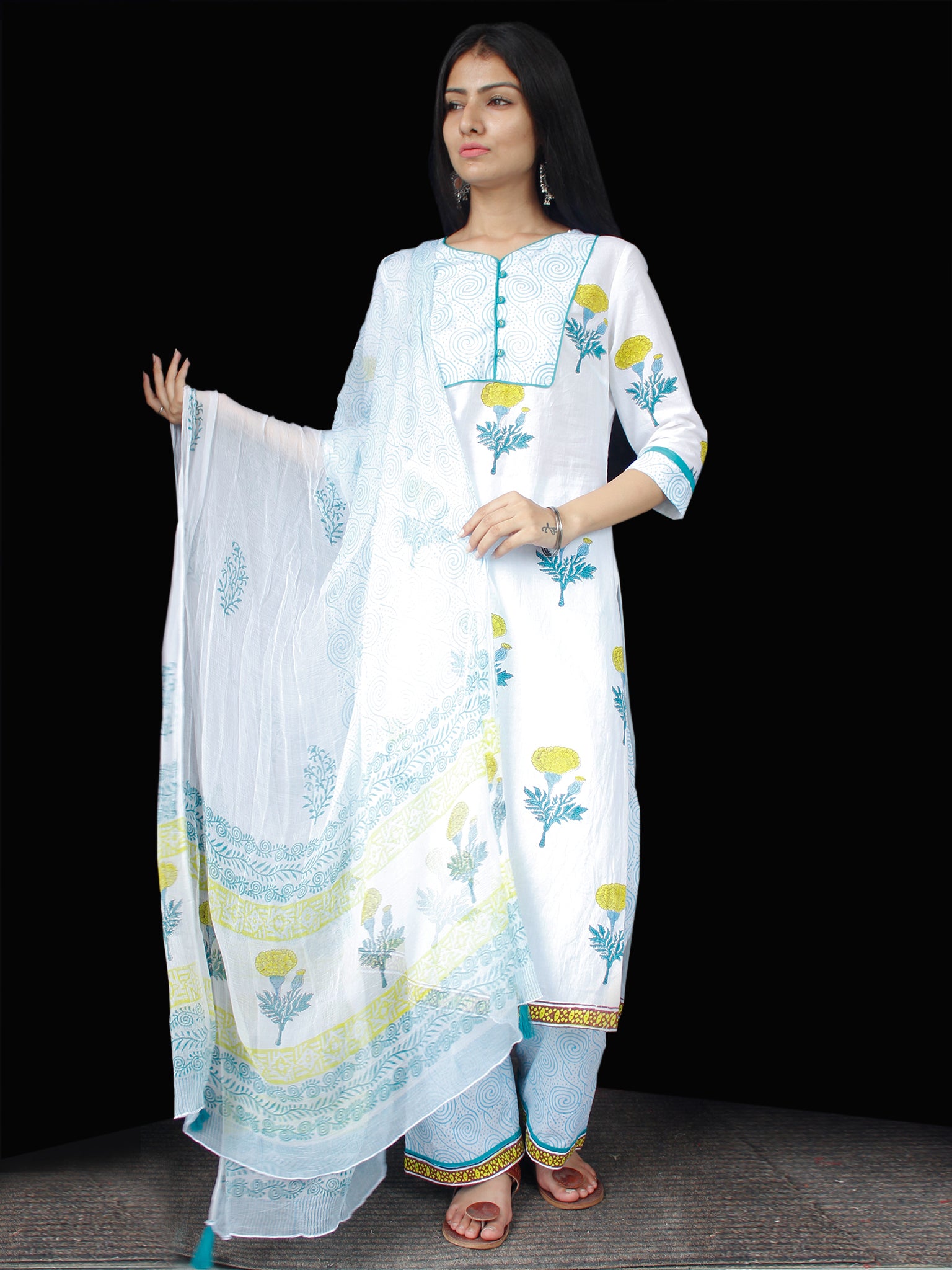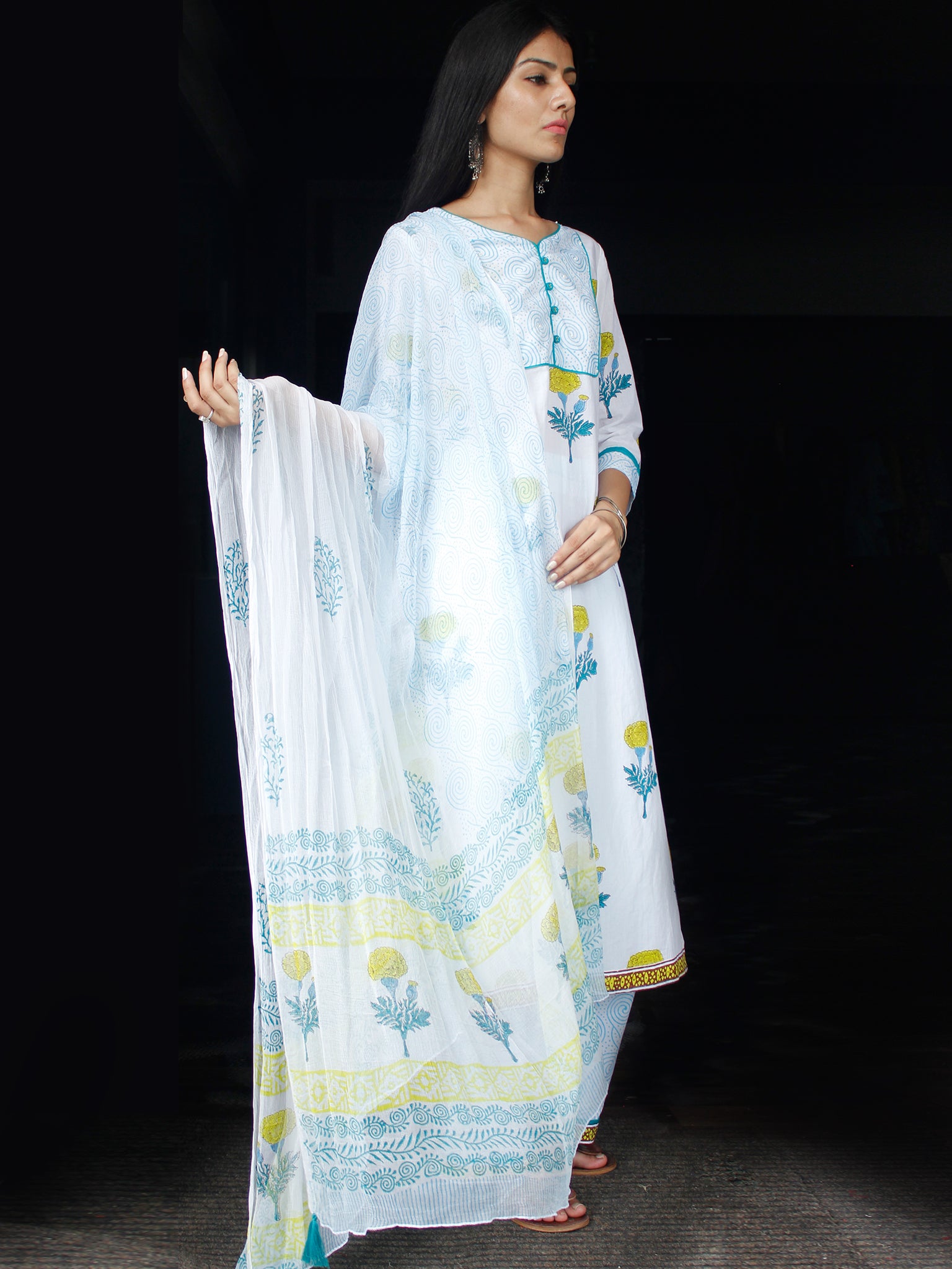 PRODUCT: Set of Kurta, Pant and Dupatta. Block printed by Artisans in Rajasthan.